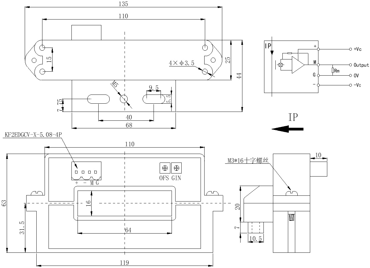 工作原理 | 工作電壓V | 額定電流IP/A | 輸出 | 精度% | 響應(yīng)時間 | 抗電強(qiáng)度kV | 工作溫度℃ | 備注 |