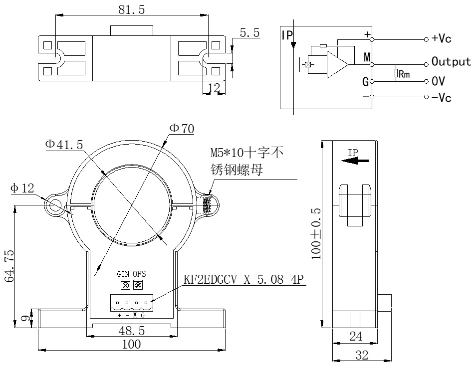 工作原理 | 工作電壓V | 額定電流IP/A | 輸出 | 精度% | 響應(yīng)時(shí)間 | 抗電強(qiáng)度kV | 工作溫度℃ | 備注 |
