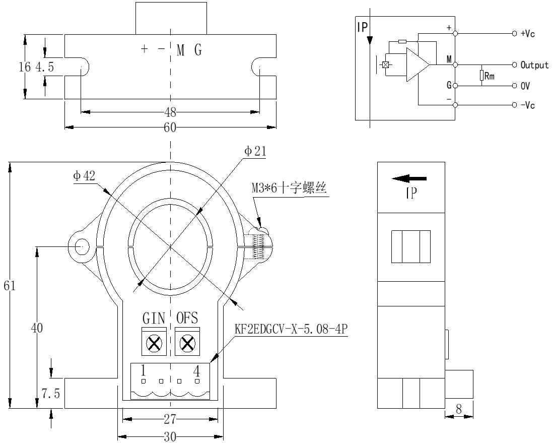 工作原理 | 工作電壓V | 額定電流IP/A | 輸出 | 精度% | 響應(yīng)時(shí)間 | 抗電強(qiáng)度kV | 工作溫度℃ | 備注 |