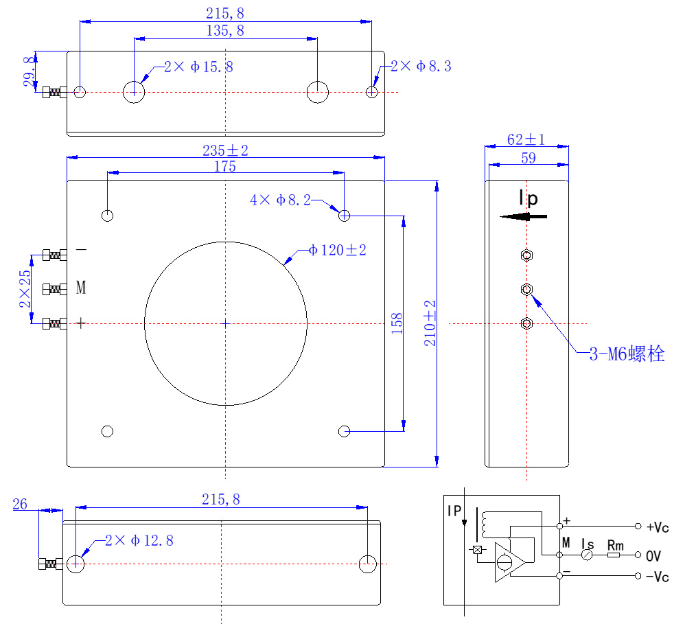 工作原理 | 工作電壓V | 額定電流IP/A | 輸出 | 精度% | 響應(yīng)時(shí)間 | 抗電強(qiáng)度kV | 工作溫度℃ | 備注 |